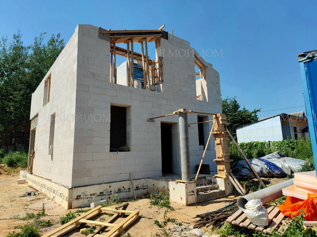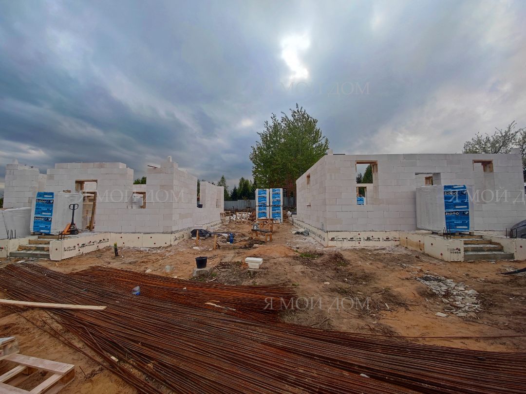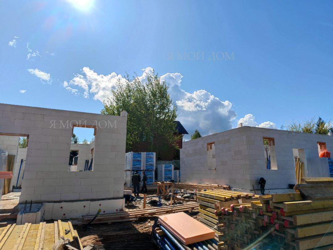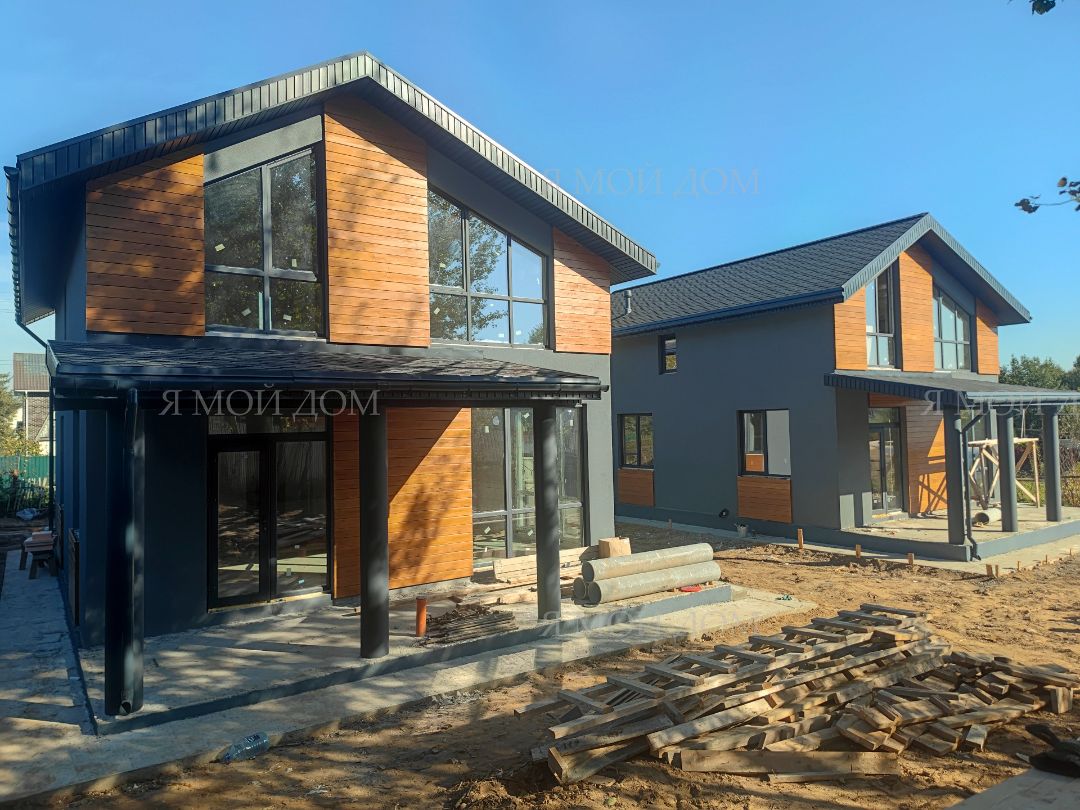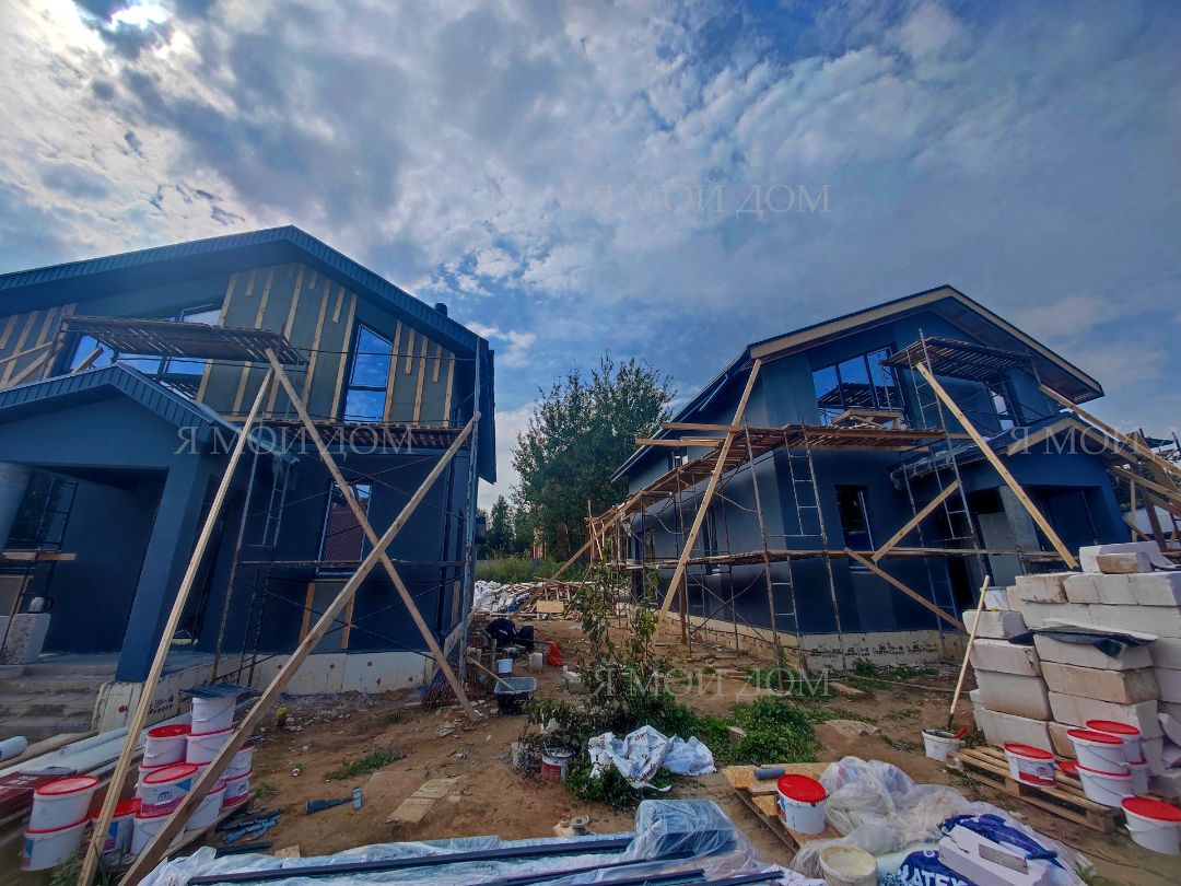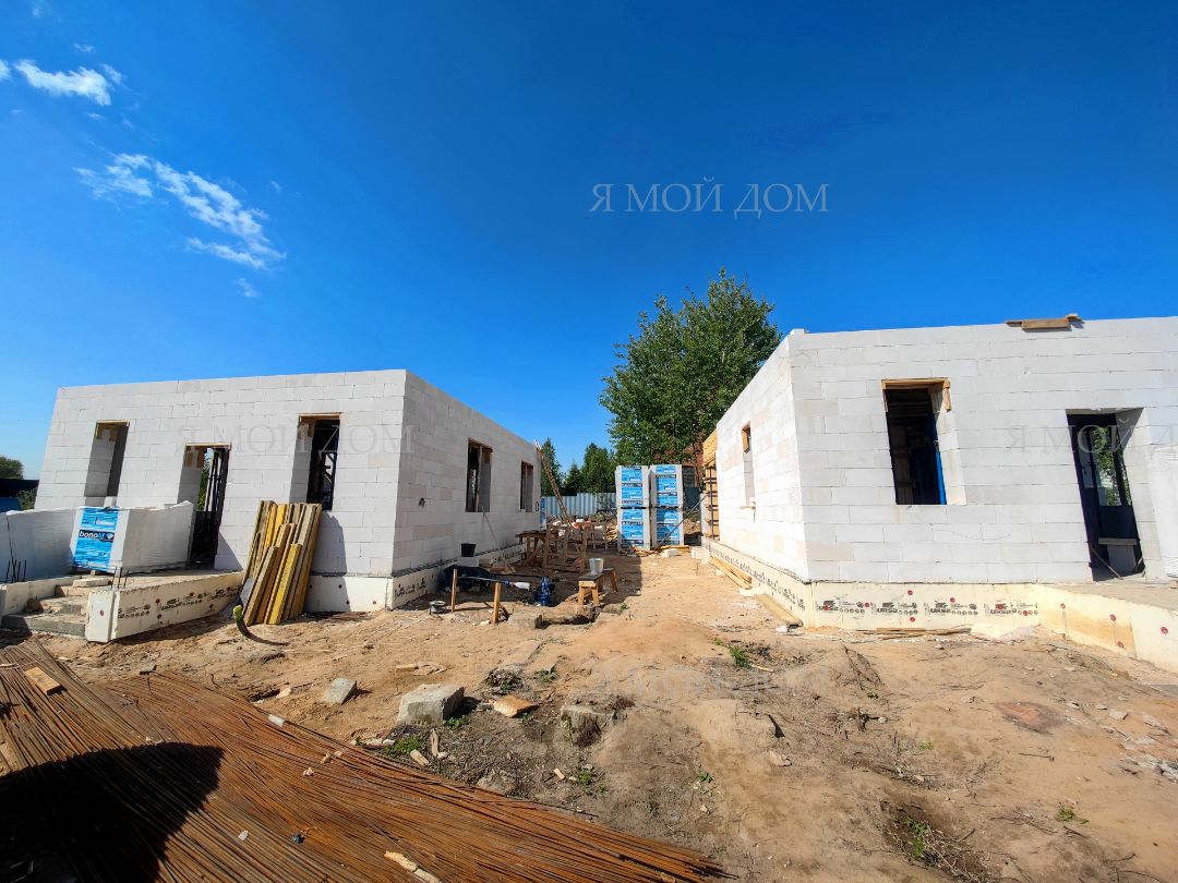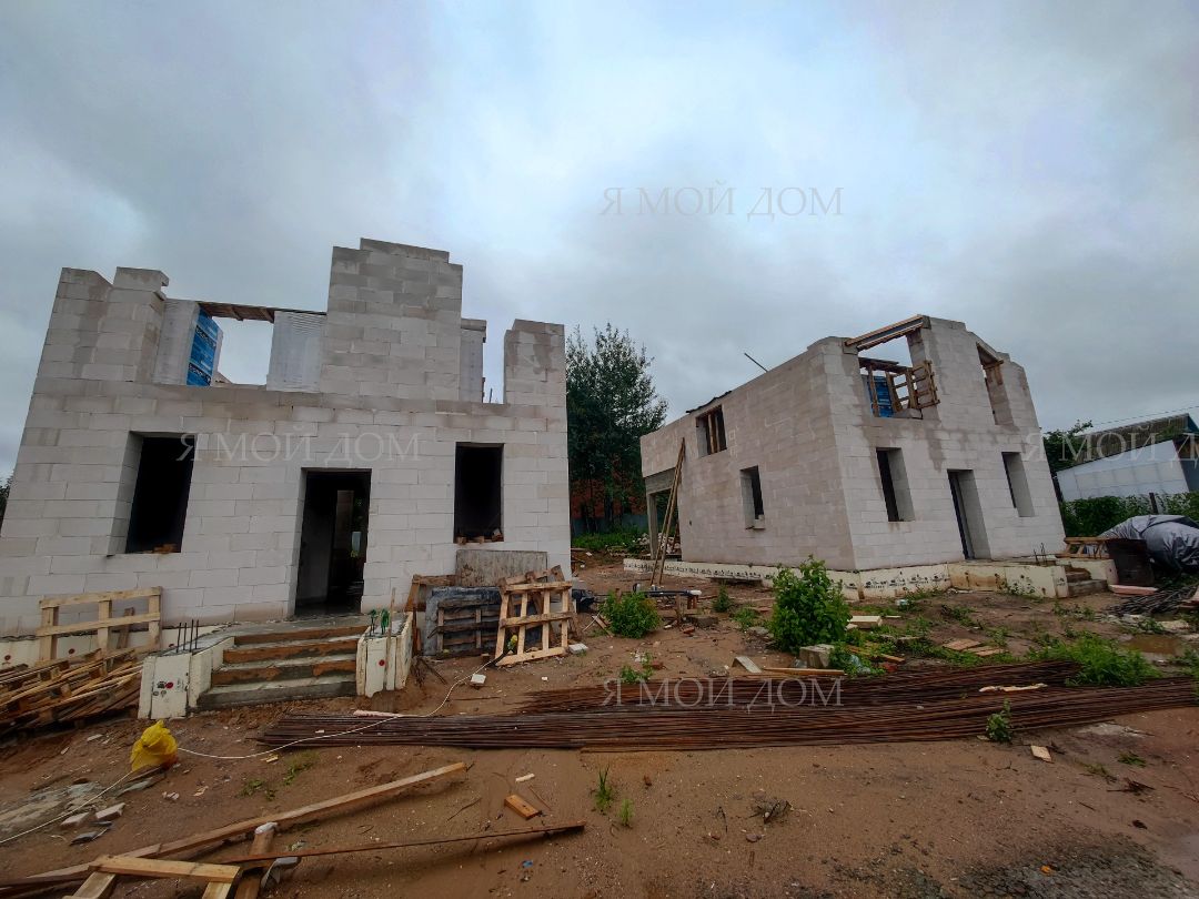 Компанией "Я Мой Дом" построены дома из газобетонных блоков каждый площадью 147 м² Проект был разработан нашим архитектором с учетом двух ключевых элементов, предоставленных заказчиком: самостоятельно нарисованного эскиза планировки и нескольких визуализаций (картинок) домов из интернета, которые служили референсами. Проект учитывает небольшие размеры участка. Были построены два смежных дома, в каждом из которых планирует проживать отдельная семья друзей. Заказчику не требовалась комната на первом этаже, благодаря чему удалось создать просторную входную зону, а также увеличить площадь кухни и гостиной.