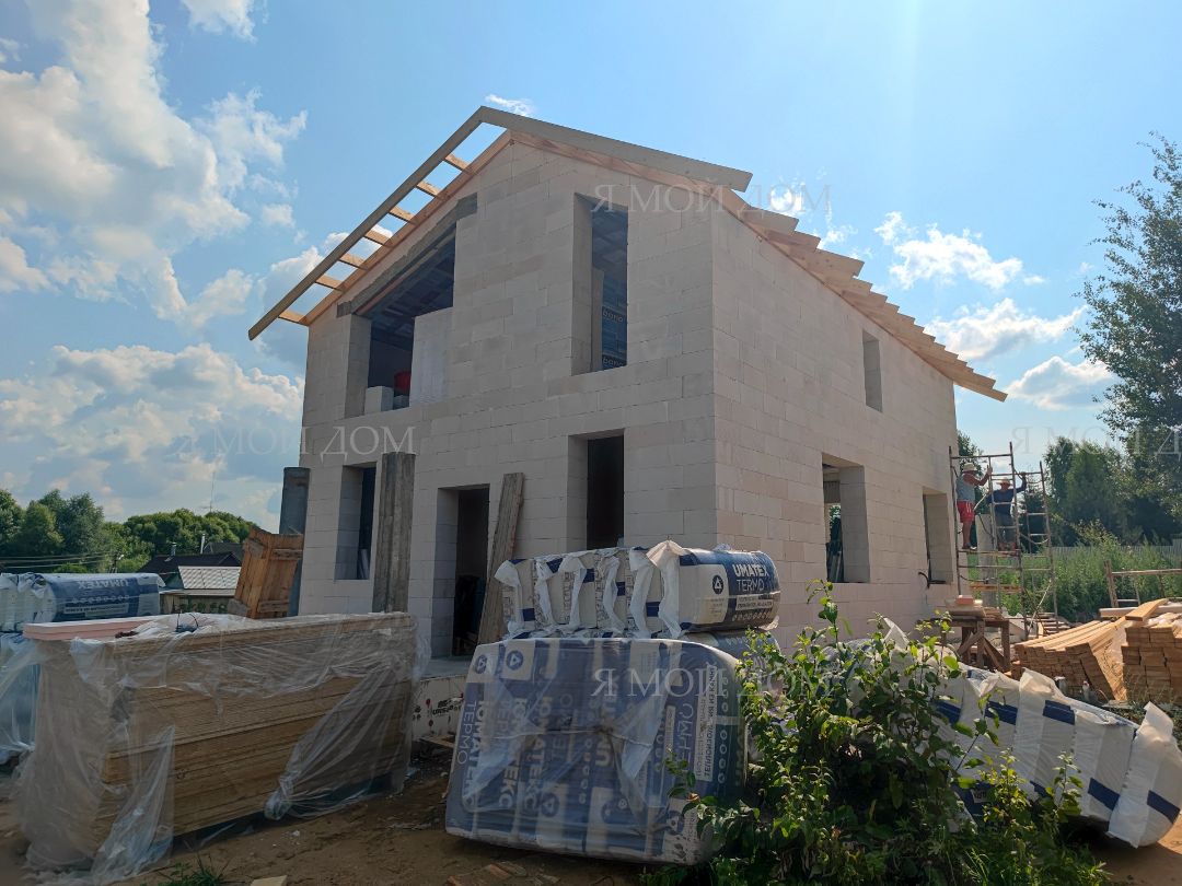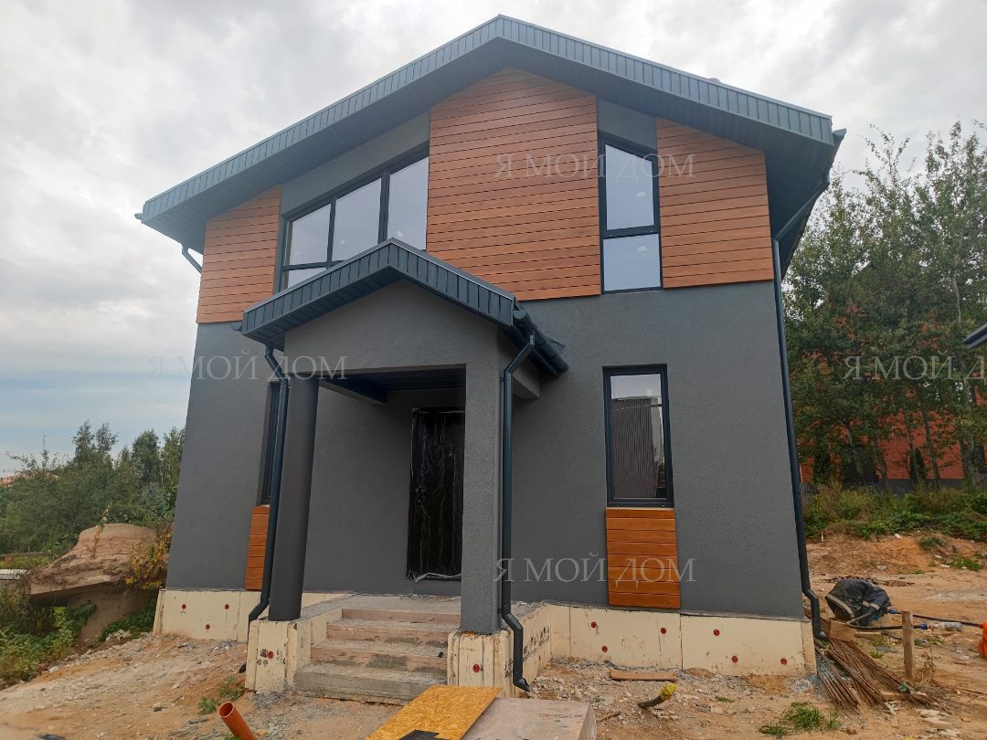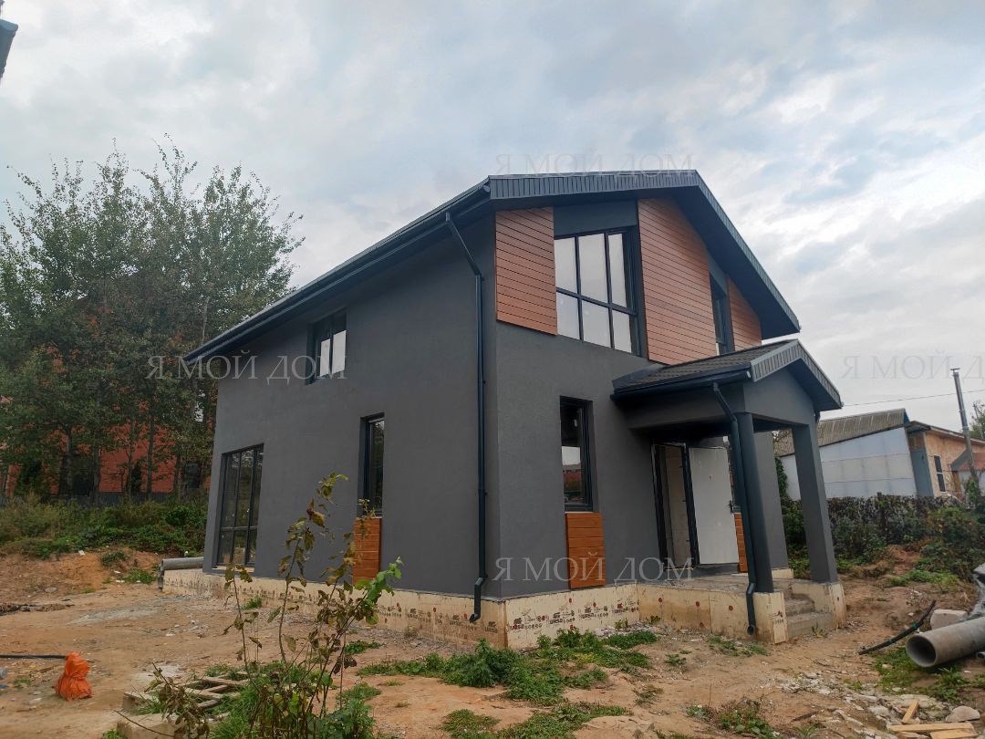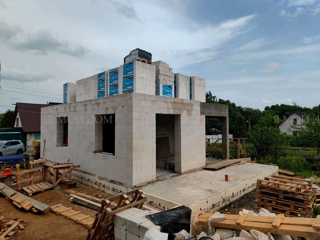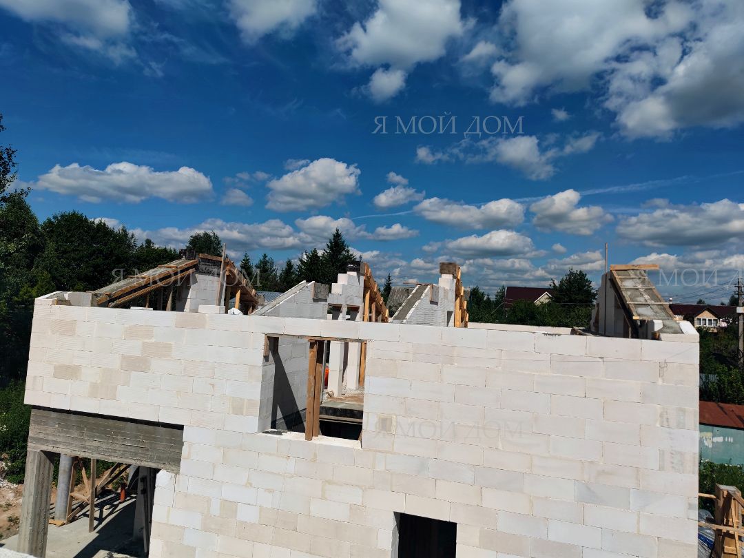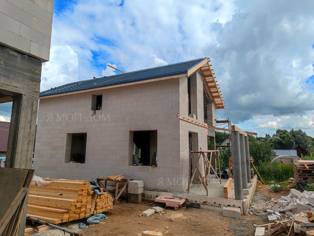 Компанией "Я Мой Дом" построены дома из газобетонных блоков каждый площадью 147 м² Проект был разработан нашим архитектором с учетом двух ключевых элементов, предоставленных заказчиком: самостоятельно нарисованного эскиза планировки и нескольких визуализаций (картинок) домов из интернета, которые служили референсами. Проект учитывает небольшие размеры участка. Были построены два смежных дома, в каждом из которых планирует проживать отдельная семья друзей. Заказчику не требовалась комната на первом этаже, благодаря чему удалось создать просторную входную зону, а также увеличить площадь кухни и гостиной.