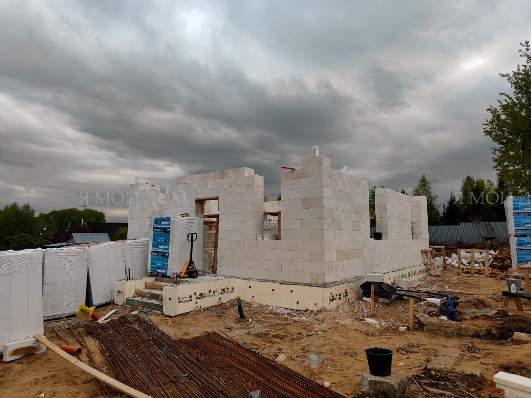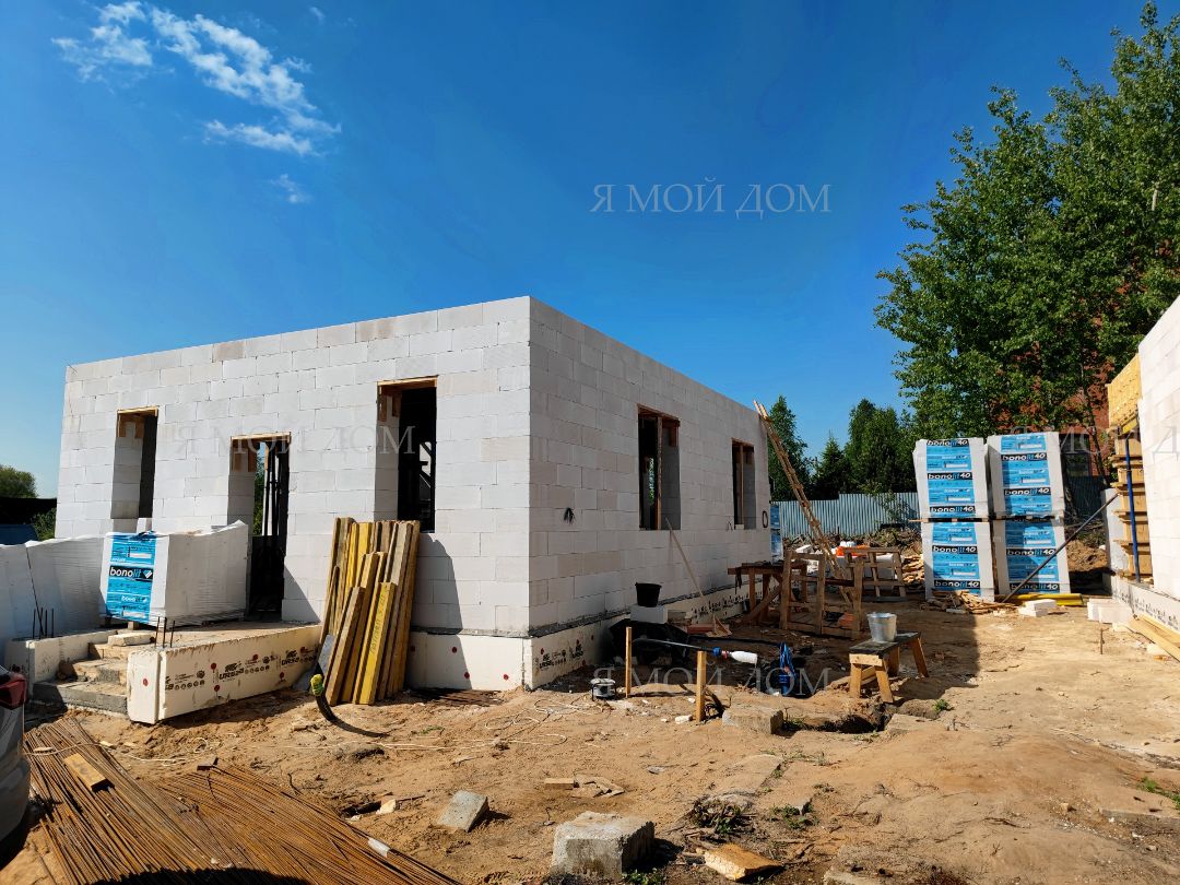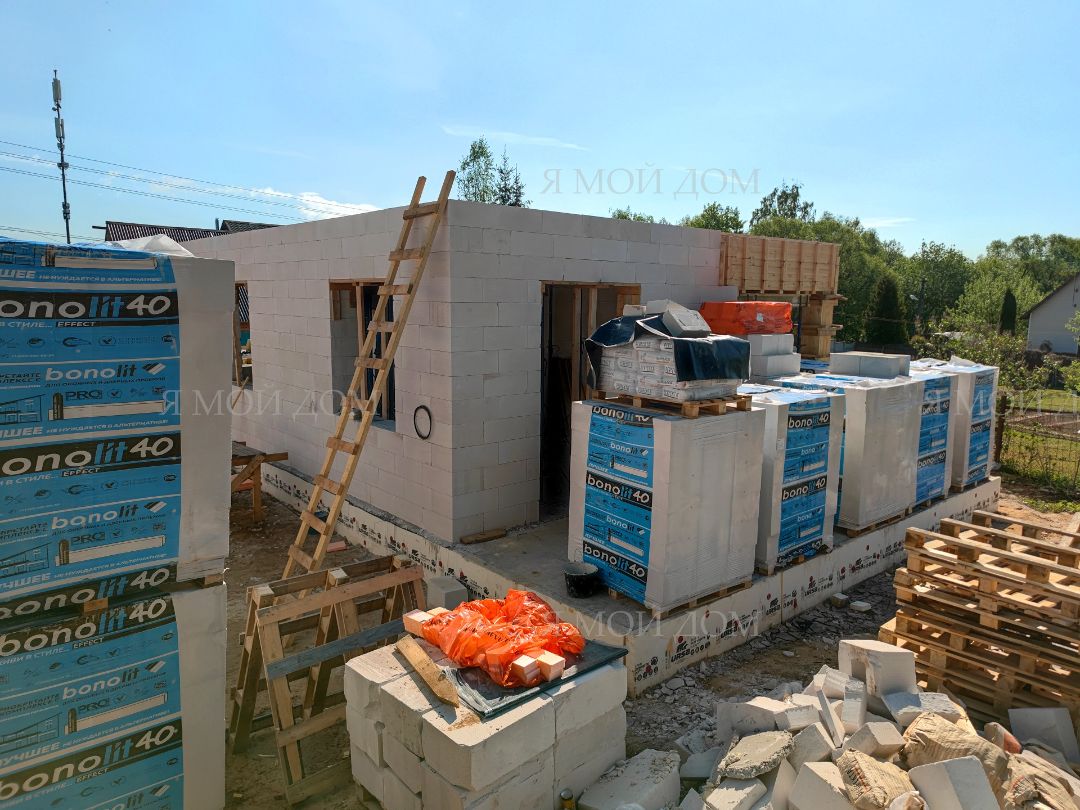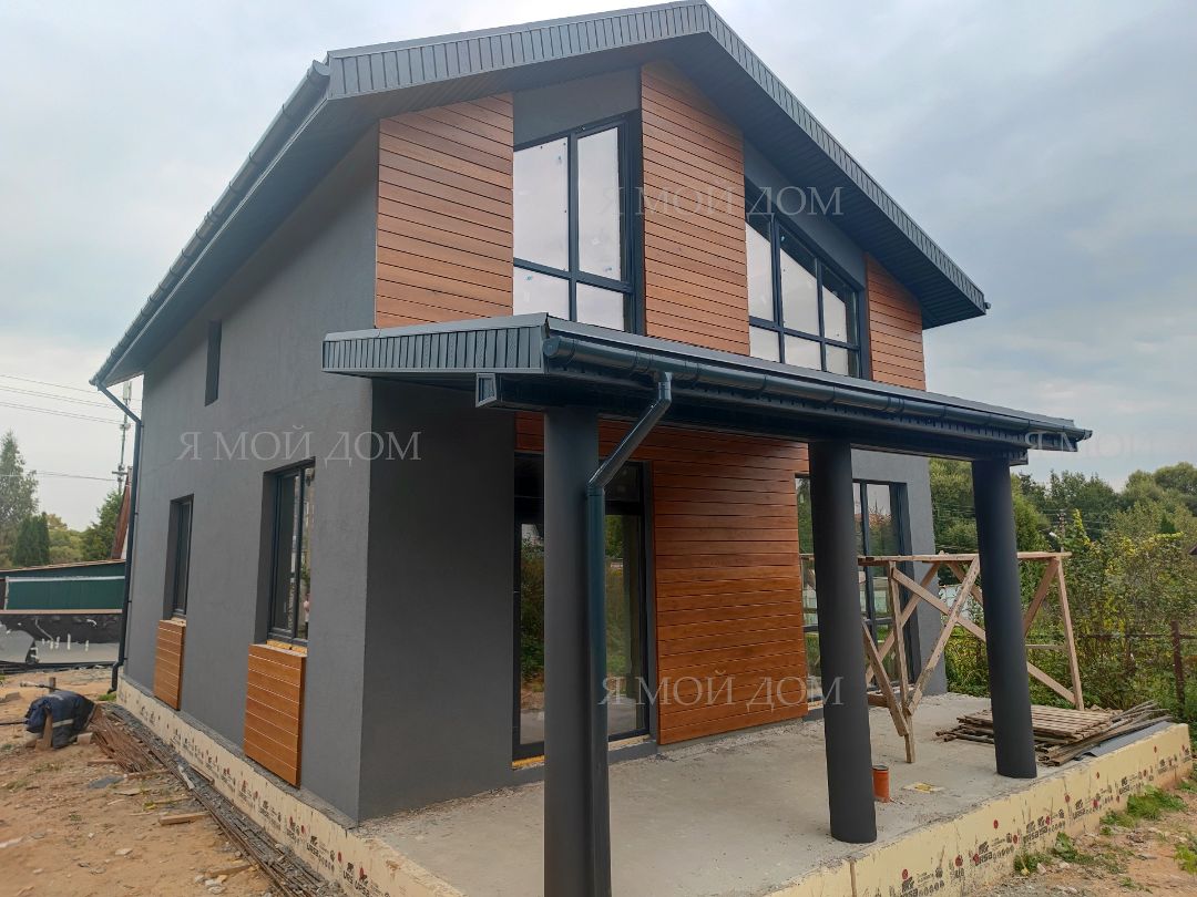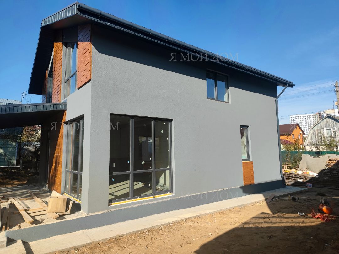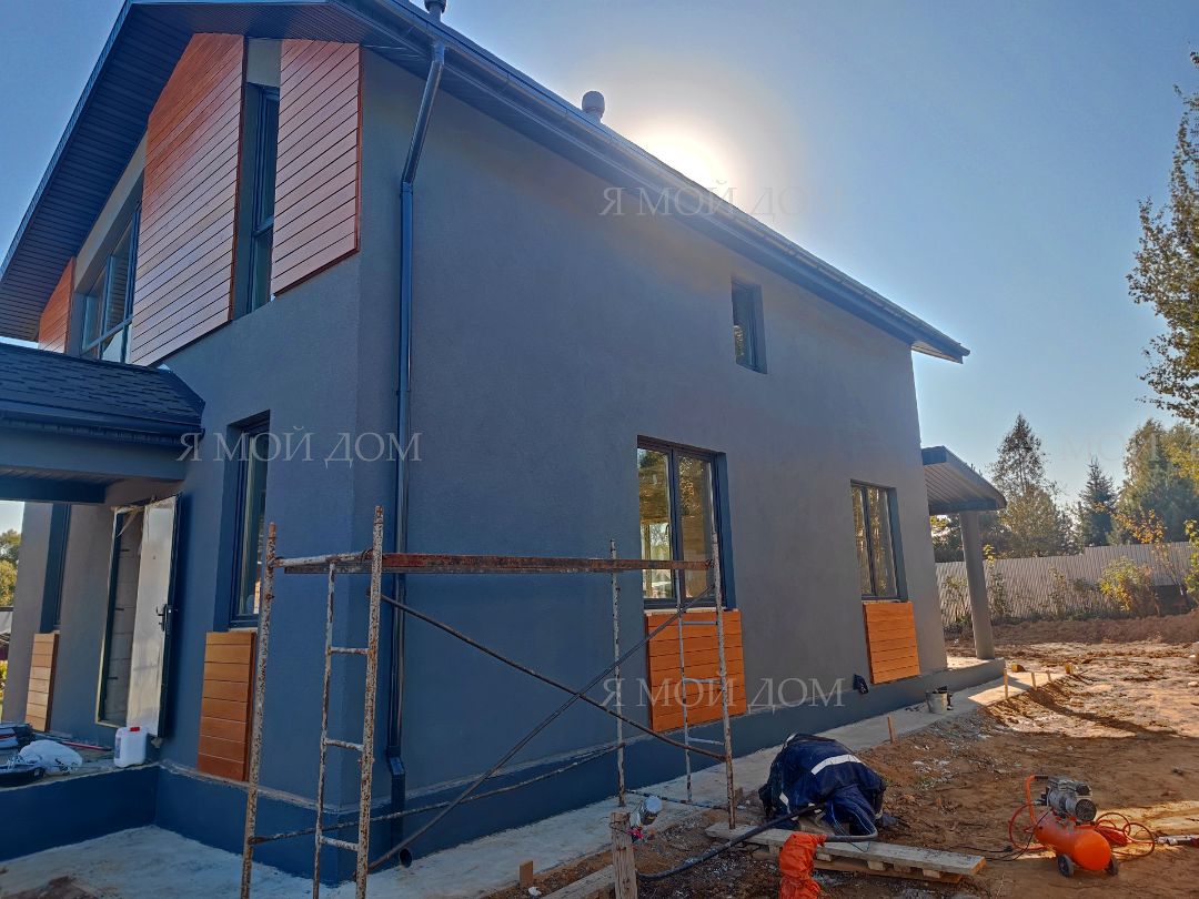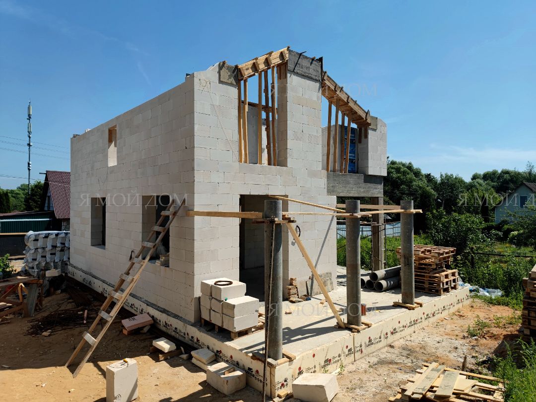 Компанией "Я Мой Дом" построены дома из газобетонных блоков каждый площадью 147 м² Проект был разработан нашим архитектором с учетом двух ключевых элементов, предоставленных заказчиком: самостоятельно нарисованного эскиза планировки и нескольких визуализаций (картинок) домов из интернета, которые служили референсами. Проект учитывает небольшие размеры участка. Были построены два смежных дома, в каждом из которых планирует проживать отдельная семья друзей. Заказчику не требовалась комната на первом этаже, благодаря чему удалось создать просторную входную зону, а также увеличить площадь кухни и гостиной.