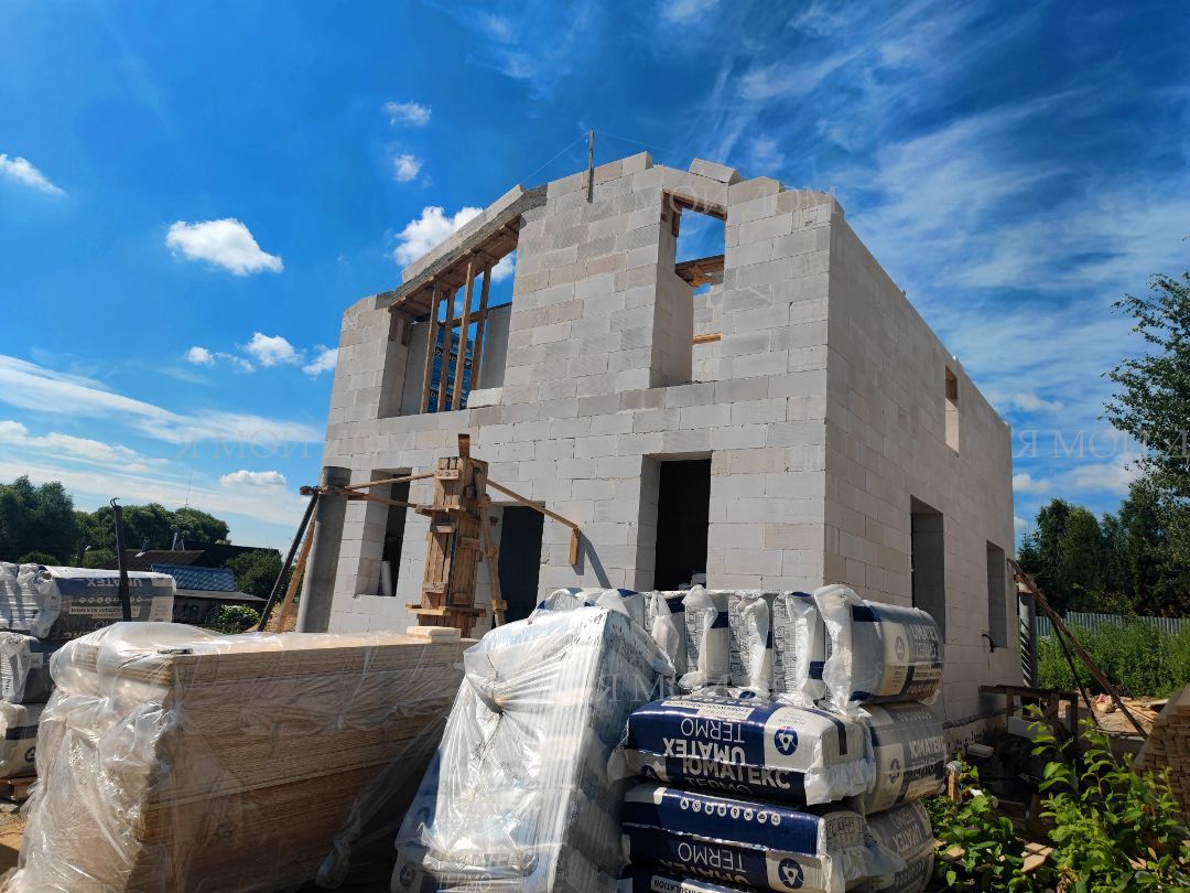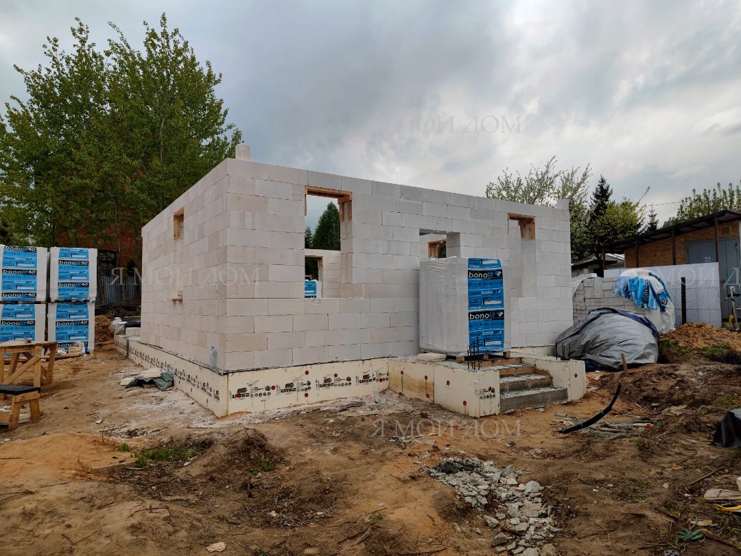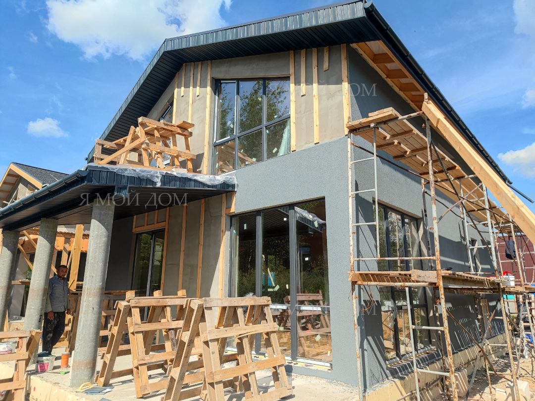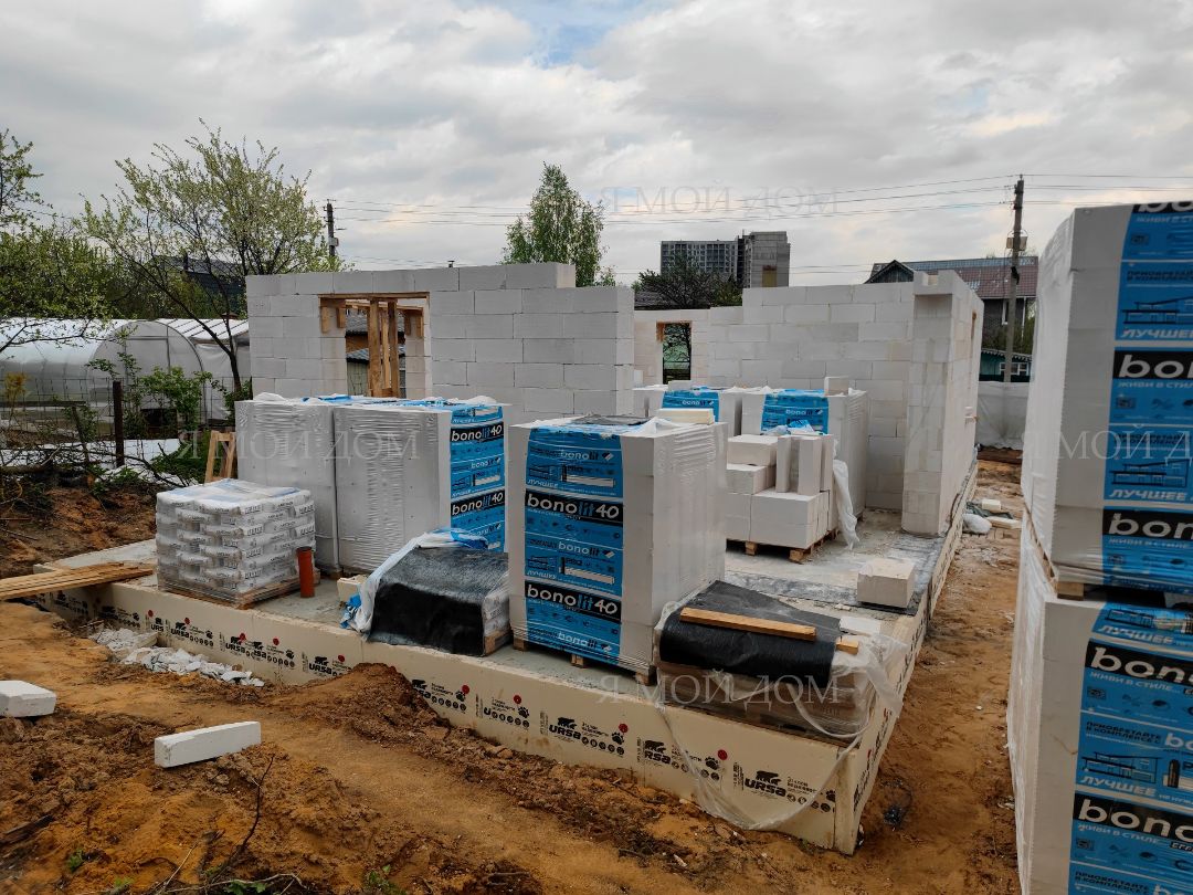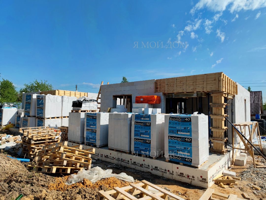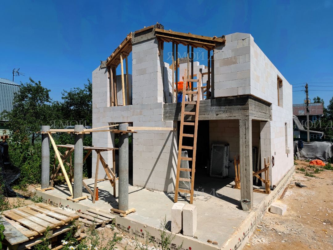 Компанией "Я Мой Дом" построены дома из газобетонных блоков каждый площадью 147 м² Проект был разработан нашим архитектором с учетом двух ключевых элементов, предоставленных заказчиком: самостоятельно нарисованного эскиза планировки и нескольких визуализаций (картинок) домов из интернета, которые служили референсами. Проект учитывает небольшие размеры участка. Были построены два смежных дома, в каждом из которых планирует проживать отдельная семья друзей. Заказчику не требовалась комната на первом этаже, благодаря чему удалось создать просторную входную зону, а также увеличить площадь кухни и гостиной.
