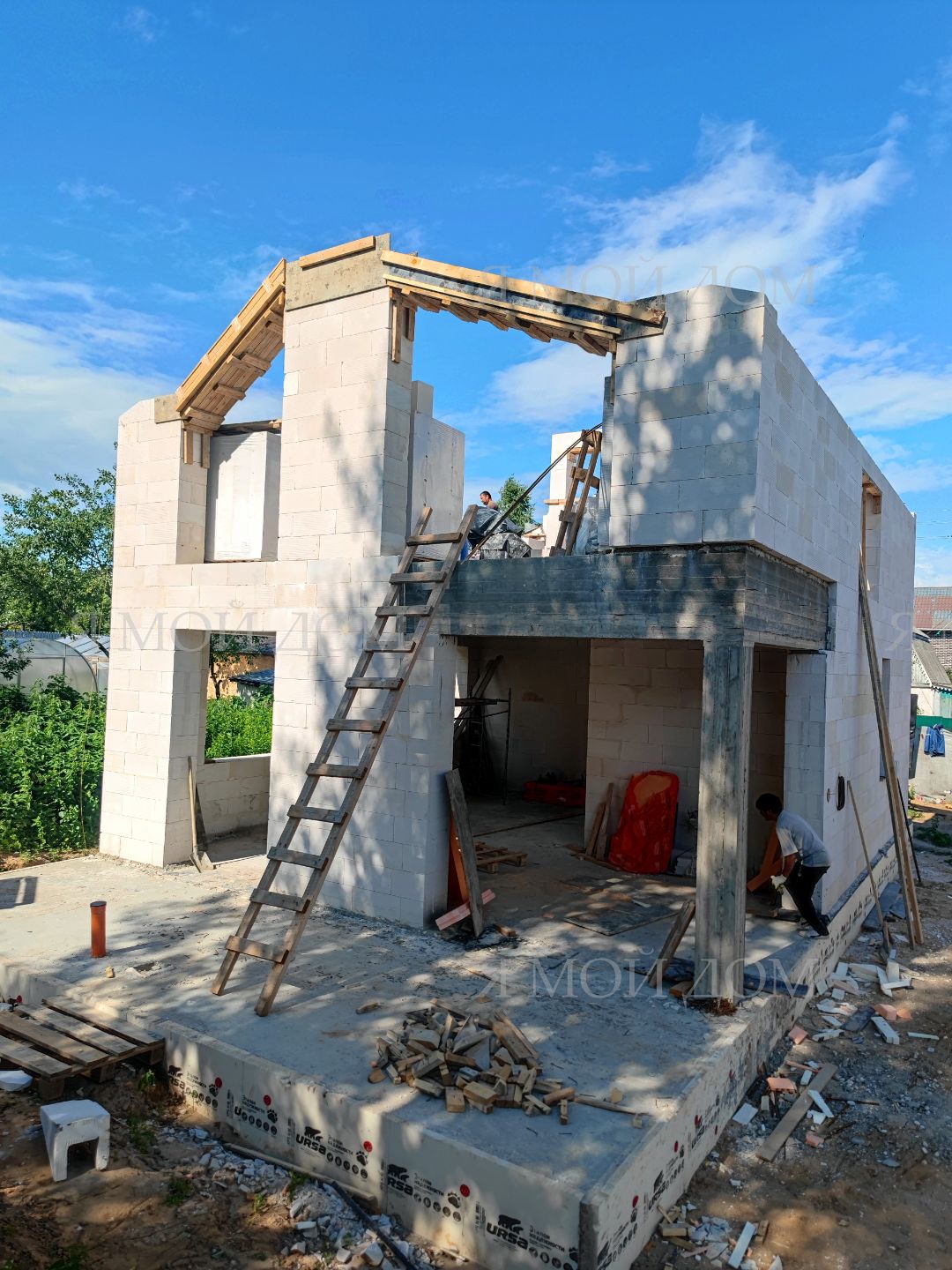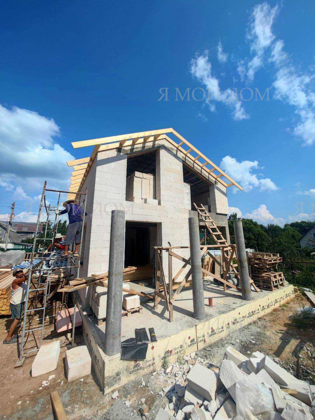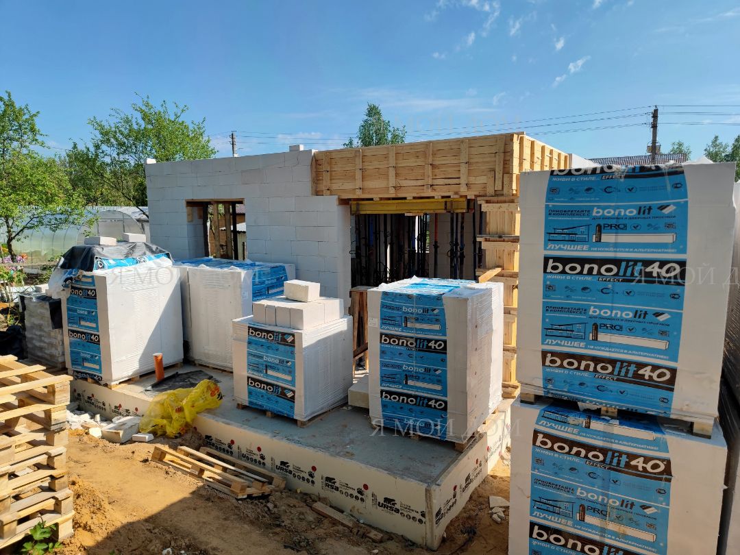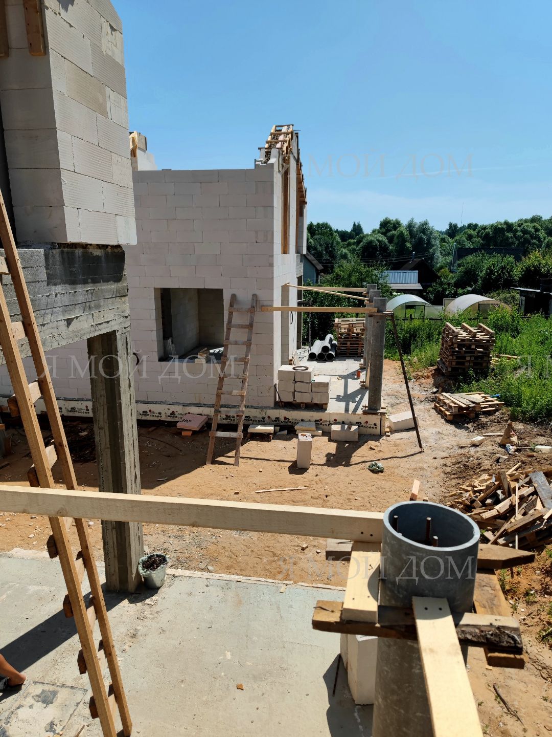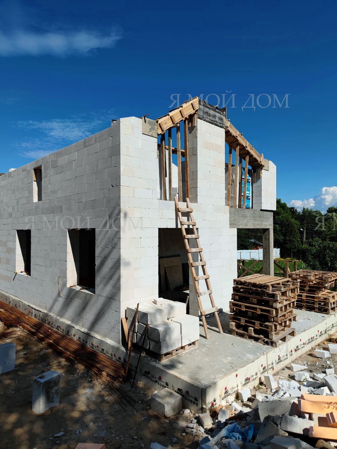 Компанией "Я Мой Дом" построены дома из газобетонных блоков каждый площадью 147 м² Проект был разработан нашим архитектором с учетом двух ключевых элементов, предоставленных заказчиком: самостоятельно нарисованного эскиза планировки и нескольких визуализаций (картинок) домов из интернета, которые служили референсами. Проект учитывает небольшие размеры участка. Были построены два смежных дома, в каждом из которых планирует проживать отдельная семья друзей. Заказчику не требовалась комната на первом этаже, благодаря чему удалось создать просторную входную зону, а также увеличить площадь кухни и гостиной.